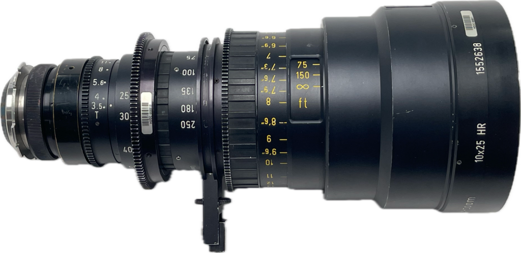 1962, the First 10x Zoom for 35mm Movie Cameras, the 25-250mm f/3.2 The 10x version for 35 mm appeared in 1962, a 25-250mm f/3.2 T3.9 that was to become the benchmark for shooting with 35mm film for nearly two decades. Angénieux also brought out a 24-240mm and a 20-120mm. This 10x zoom, a key invention in the history of the cinema, was to have a great influence on the cinematographic style of an entire generation. It was widely used on full-length films and documentaries for nearly 23 years until the improved 25-250 HP version appeared in 1985.